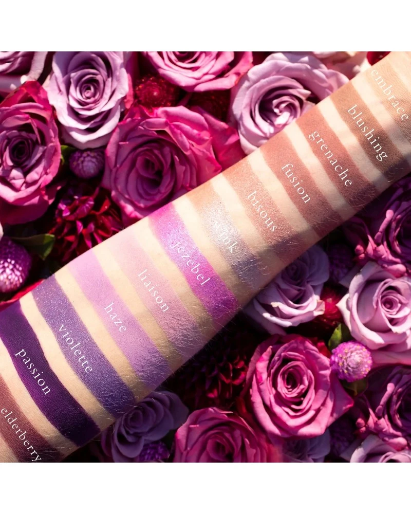 Shades 1 (Embrace), 2 (Blushing), 3 (Grenache), 4 (Fusion), 8 (Liason), 9 (Haze), 12 (Elderberry): Talc, Mica, Octyldodecyl Stearoyl Stearate, Zinc Stearate. Shade 5 (Bisous): Mica, Calcium Aluminum Borosilicate, Talc, Octyldodecyl Stearoyl Stearate, Silica, Zinc Stearate. Shade 6 (Wink): Aluminum Calcium Sodium Silicate, Mica, Talc, Octyldodecyl Stearoyl Stearate, Zinc Stearate. Shade 7 (Jezebel): Calcium Aluminum Borosilicate, Mica, Silica, Octyldodecyl Stearoyl Stearate, Talc, Zinc Stearate. Shade 10 (Violette): Aluminum Calcium Sodium Silicate, Mica, Talc, Octyldodecyl Stearoyl Stearate, Synthetic Fluorphlogopite, Calcium Aluminum Borosilicate, Silica, Zinc Stearate. Shade 11 (Passion): Talc, Mica, Octyldodecyl Stearoyl Stearate, Octyldodecanol, Zinc Stearate. Vegan Shades: 6,11. (May Contain +/-: Titanium Dioxide CI 77891, Iron Oxides CI 77491/77492/77499, Yellow 5 Lake CI 19140, Hydrogenated Polyisobutene, Red 28 Cl 45410, Ultramarines Blue CI 77007, Manganese Violet CI 77742, FD&C Blue 1 CI 42090, Aluminum CI 77000, Ferric Ferrocyanide CI 77510, Chromium Oxide Greens CI 77288, Carmine CI 75470, Tin Oxide, Sodium Benzoate, Potassium Sorbate).