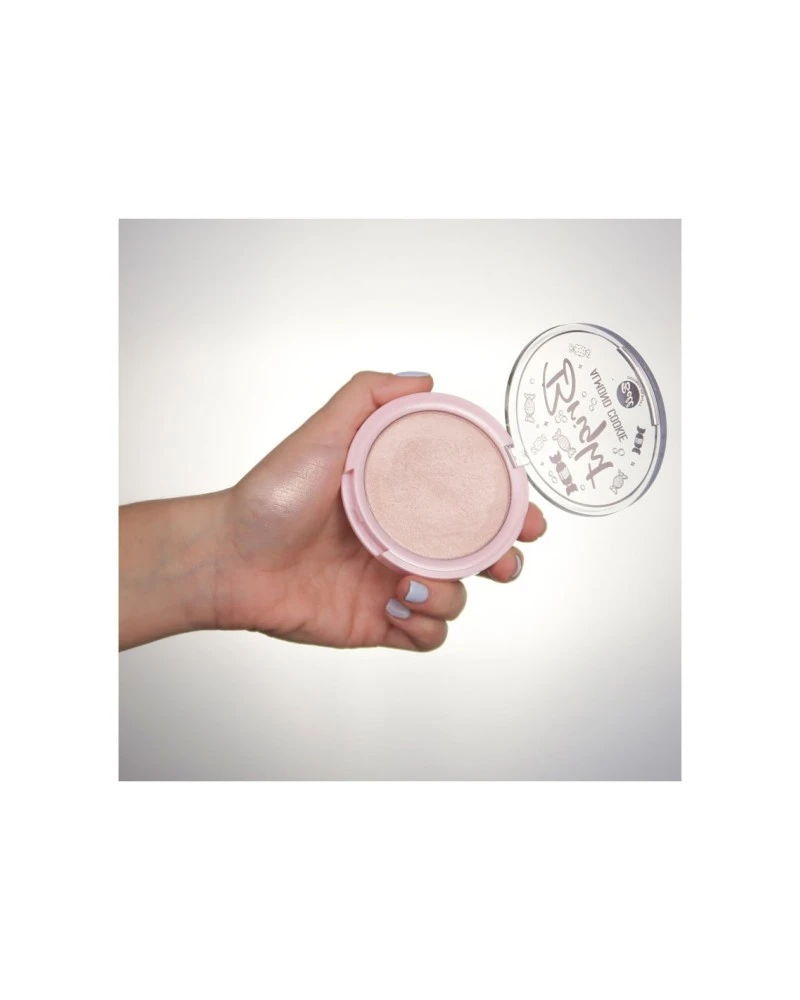 El iluminador facial con aroma de galleta de almendra proporciona un acabado luminoso y elegante para el maquillaje en un tono versátil en rosa champán.