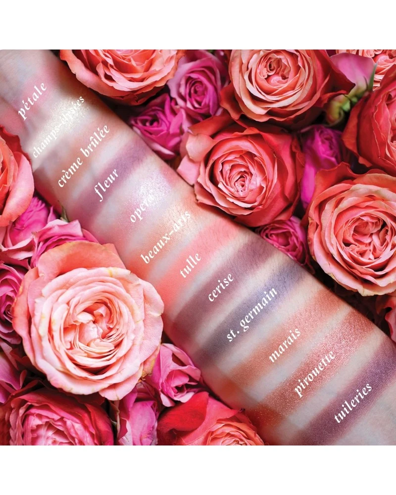 Shades 1 (Pétale), 4 (Fleur), 7 (Tulle): Talc, Mica, Ocyldodecyl Stearoyl Stearate, Zinc Stearate. Shade 2 (Champs-Elysées): Mica, Calcium Sodium Borosilicate, Talc, Octyldodecyl Stearoyl Stearate, Zinc Stearate, Silica. Shades 3 (Crème Brûlée), 9 (St, Germain), 12 (Tuileries): Mica, Talc, Octyldodecyl Stearoyl Stearate, Zinc Stearate. Shade 5 (Opera): Mica, Octyldodecyl Stearoyl Stearate, Talc, Zinc Stearate, Silica. Shade 6 (Beaux-Arts): Mica, Octyldodecyl Stearoyl Stearate, Talc, Zinc Stearate, Silica. Shade 8 (Cerise): Talc, Mica, Calcium Sodium Borosilicate, Octyldodecyl Stearoyl Stearate, Zinc Stearate. Shade 10 (Marais) : Mica, Octyldodecyl Stearoyl Stearate, Talc, Zinc Stearate, Alumina. Shade 11 (Pirouette) : Mica, Talc, Octyldodecyl Stearoyl Stearate, Zinc Stearate, Silica. Vegan Shades: 1,2,3,6,9,10,11,12. (May Contain +/- : Titanium Dioxide CI 77891, Iron Oxides CI 77491/77492/77499, Ferric Ferrocyanide CI 77510, Ultramarines Blue CI 77007, Synthetic Fluorphlogopite, Manganeze Violet CI 77742, Tin Oxide CI 77861, Carmine CI 75470, Black 2 CI 77266, Yellow 5 Lake CI 19140, Potassium Sorbate, Sodium Benzoate.)