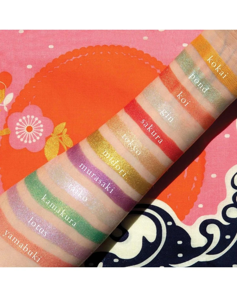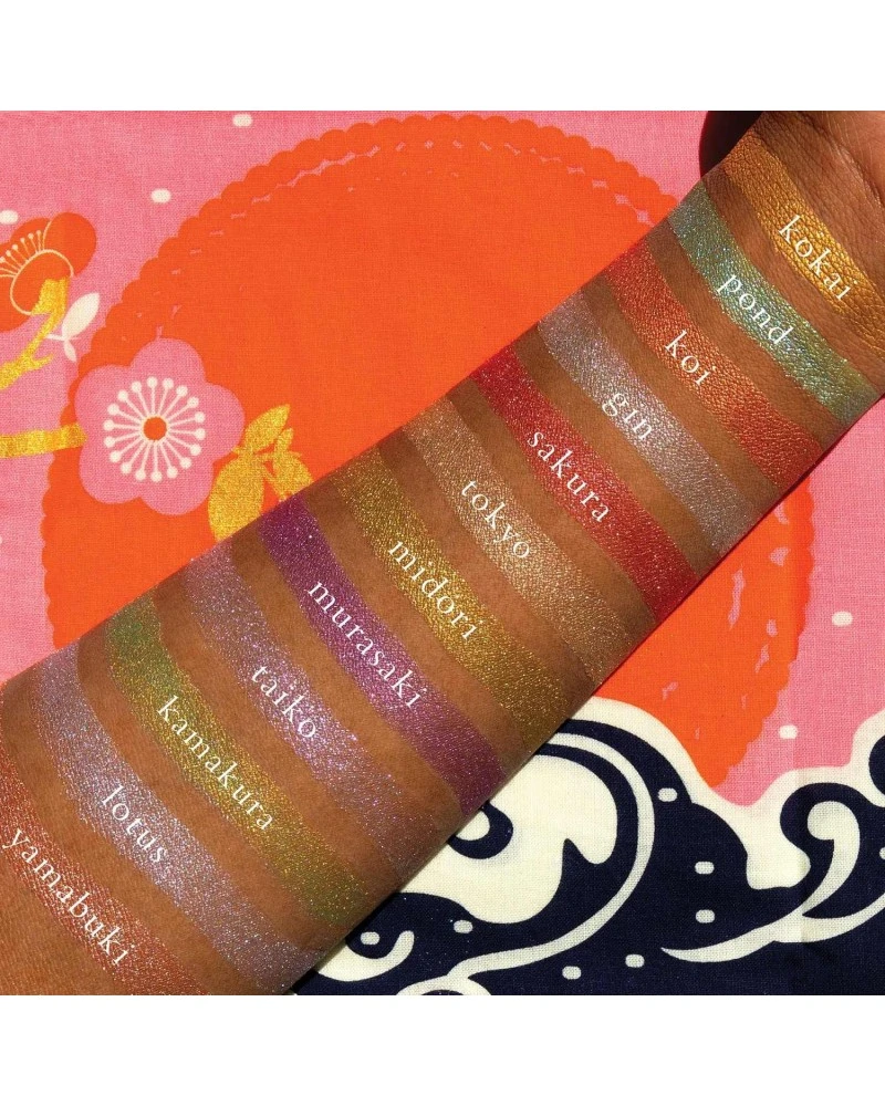 Shade 12 Yamabuki: Calcium Aluminum Borosilicate, Mica, Octyldodecyl Stearoyl Stearate, Talc, Silica, Zinc Stearate. Vegan Shades: 1,2,4,6,7,9,10. (May Contain +/- : Titanium Dioxide CI 77891, Tin Oxide CI 77861, Iron Oxides CI 77491/77492/77499, Carmine CI 75470, Synthetic Fluorophlagopite, Chromium Oxide Greens CI 77288, Yellow 5 CI 19140, FD&C Blue 1, Manganese Violet CI 77742, Red 40 Lake CI 15850, Ferric Ferrocyanide CI 77510.)
