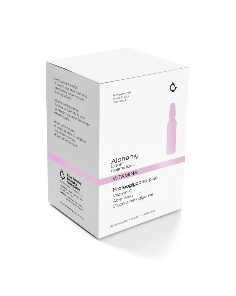 Ampollas concentradas monodosis de tratamiento para revitalizar la piel en profundidad gracias a sus potentes activos como la vitamina C, el Aloe Vera y los glicosaminoglicanos que su principal función es la de mantener la matriz extracelular hidratada, captando y reteniendo agua en la piel.