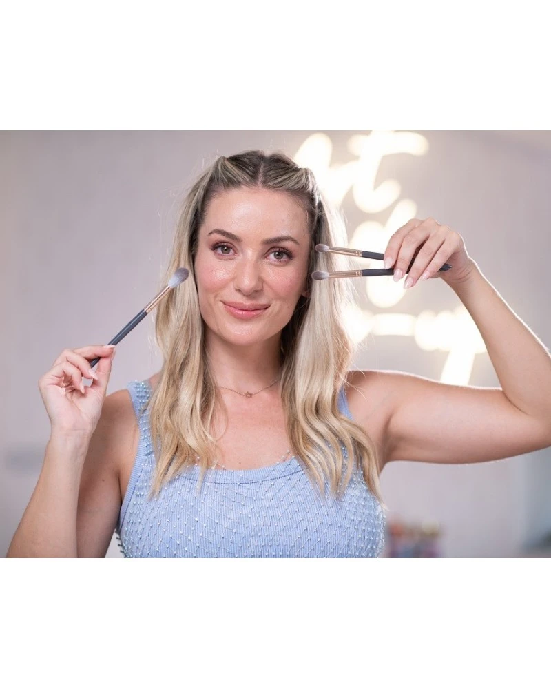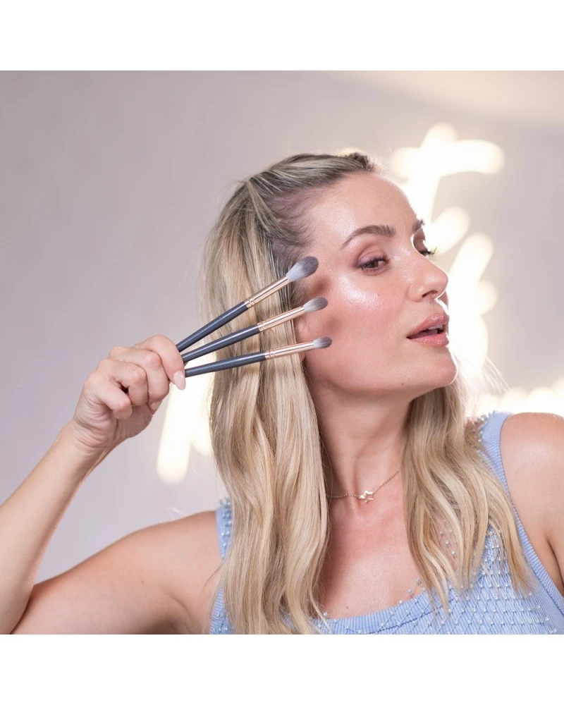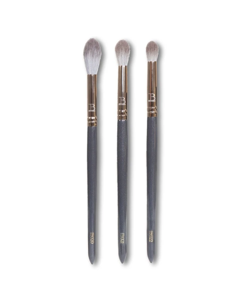El mango y el pelo de la brocha son en tonalidades grises, la virola y la numeración en un tono champán-dorado.